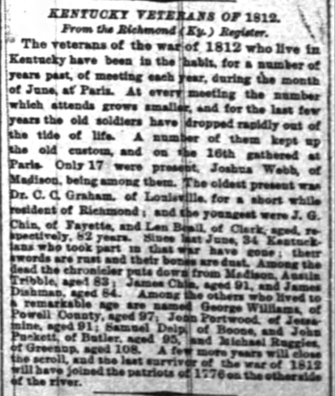 - [S262] "Kentucky Veterans of 1812,"James Dishman age 84, The New York Times, New York City, New York, 4 Jul 1879, p.4 (https://www.newspapers.com/image/20530860 : accessed 27 May 2025); citing Newspapers.com.
