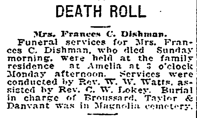- [S269] "Death Roll,"Frances C. Dishman, Beaumont Enterprise, Beaumont, Jefferson County, Texas, 3 Jan 1922 (https://www.genealogybank.com/doc/newspapers/image/v2%3A11FCD9F6C526DCD9%40GB3NEWS-16833B4067A05092%402423058-1683345F972C3F7A%406-1683345F972C3F7A%40?lname=dishman&fname=frances&dateType=range&formDateFlex=exact&rgtoDate=01/31-1931&rgfromDate=01/01/1922 : accessed 12 May 2025); citing GenealogyBank.