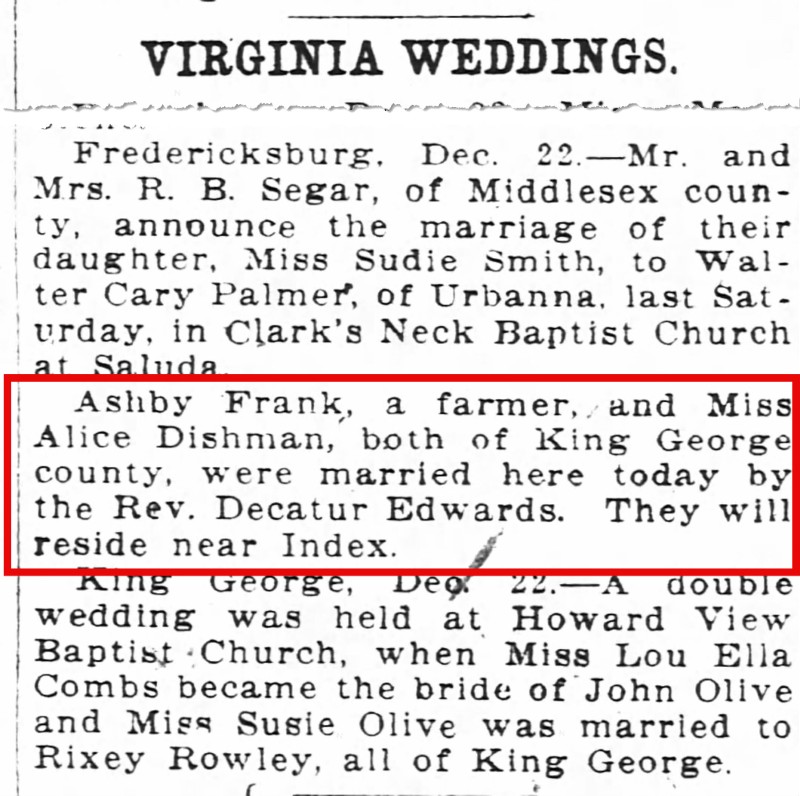 - [S469] "Virginia Weddings,"Ashby Frank and Alice Dishman marriage, The Washington Post, Washington, District of Columbia, 23 Dec 1920, p.3 (https://www.newspapers.com/image/28804425 : accessed 29 May 2025); citing Newspapers.com.