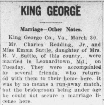 - [S685] "King George, Marriage-Other Notes,"Charles Redding Jr. and Emma Suttle marriage, Daily Star, Fredericksburg, Virginia, 31 Mar 1911, p.2 c.4 (https://www.virginiachronicle.com/?a=d&d=DS19110331.1.2 : accessed 29 May 2025); citing Virginia Chronicle - Digital Newspaper Archive.
