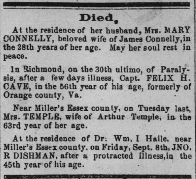 - [S712] "Obituary Notices,"William J. Dishman, The Virginia Herald, Fredericksburg, Virginia, 16 Apr 1855, p.3 c.1 (https://www.virginiachronicle.com/?a=d&d=VHR18550416.1.3 : accessed 24 May 2025); citing Virginia Chronicle - Digital Newspaper Archive.