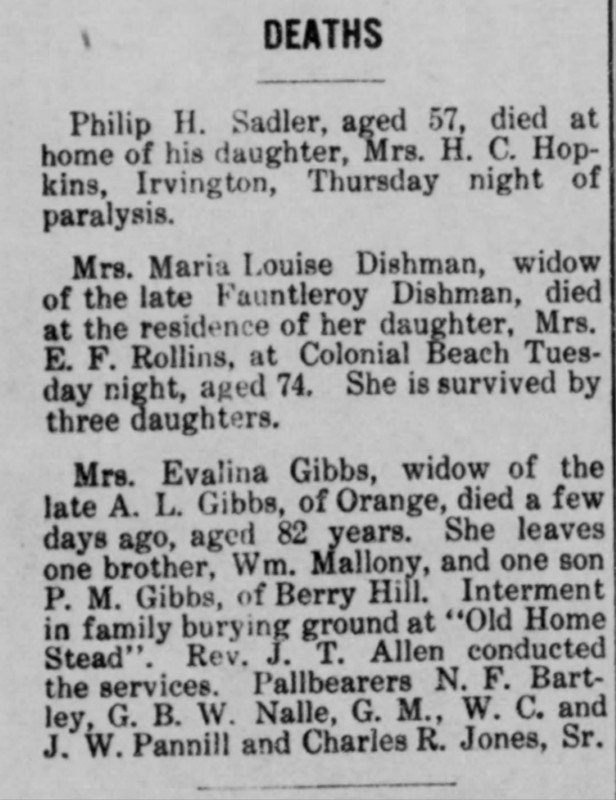 - [S714] "Deaths,"Maria Louise Dishman, The Free Lance-Star, Fredericksburg, Virginia, 13 Sep 1910 (https://www.newspapers.com/image/70930163 : accessed 13 May 2025); citing Newspapers.com.