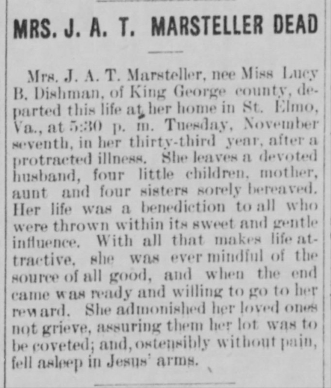 - [S718] "Mrs. J. A. T. Marsteller Dead,"Lucy B. Marsteller, The Free Lance-Star, Fredericksburg, Virginia, 16 Nov 1905 (https://www.newspapers.com/image/71060812 : accessed 12 May 2025); citing Newspapers.com.