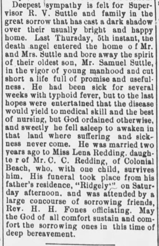 - [S722] "King George County,"Samuel Suttle, The Daily Star, Fredericksburg, Virginia, 13 Jan 1899, p.3 c.3 (https://www.newspapers.com/image/795882477 : accessed 22 May 2025); citing Newspapers.com.