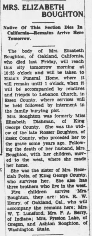 - [S735] "Mrs. Elizabeth Boughton,"Elizabeth Boughton, The Free Lance-Star, Fredericksburg, Virginia, 13 May 1930 (https://www.newspapers.com/image/866645768 : accessed 11 May 2025); citing Newspapers.com.