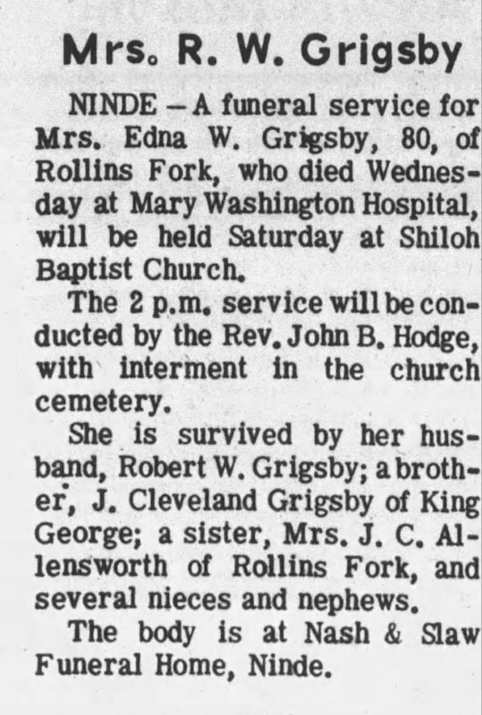 - [S736] "Mrs. R.W. Grigsby,"Edna W. Grigsby, The Free Lance-Star, Fredericksburg, Virginia, 22 Dec 1966 (https://www.newspapers.com/image/1141541524 : accessed 9 Feb 2014).