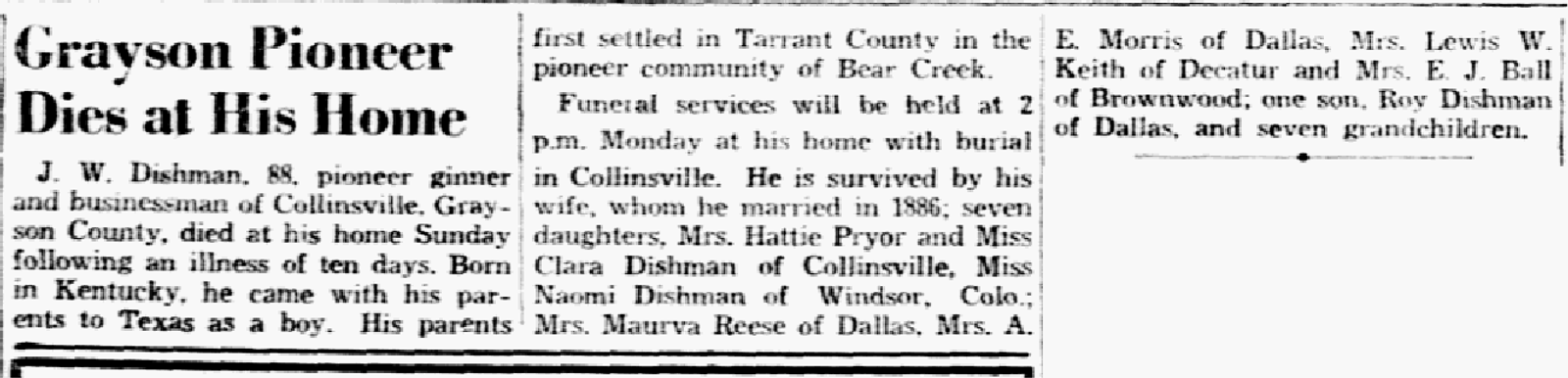 - [S745] "Grayson Pioneer Dies at His Home,"John W. Dishman, Dallas Morning News, Dallas, Dallas County, Texas, 11 Mar 1940 (https://www.genealogybank.com/doc/newspapers/image/v2%3A0F99DDB671832188%40GB3NEWS-10338293D52EE2E5%402429700-1033829409C1F47A%406-1033829576EA16BB%40Grayson%2BPioneer%2BDies%2Bat%2BHis%2BHome?lname=dishman&dateType=range&formDateFlex=exact&rgtoDate=1940&rgfromDate=1940 : accessed 7 Jan 2017); citing GenealogyBank.com.