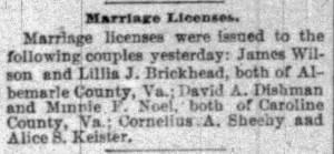 - [S505] "Marriage Licenses,"David Dishman and Minnie Noel marriage, The Washington Post, Washington, District of Columbia, 28 Jul 1887, p.4 (https://www.newspapers.com/image/1037708308 : accessed 29 May 2025); citing Newspapers.com.