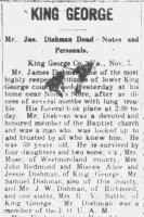 - [S721] "Mr. Jas. Dishman Dead,"James Dishman, The Daily Star, Fredericksburg, Virginia, 9 Nov 1912, p.2 (https://www.newspapers.com/image/797239542 : accessed 22 May 2025); citing Newspapers.com.