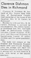 - [S729] "Clarence Dishman Dies in Richmond,"Clarence M. Dishman, The Free Lance-Star, Fredericksburg, Virginia, 9 Apr 1952 (https://www.newspapers.com/image/866553325 : accessed 7 Jan 2017); citing Newspapers.com.