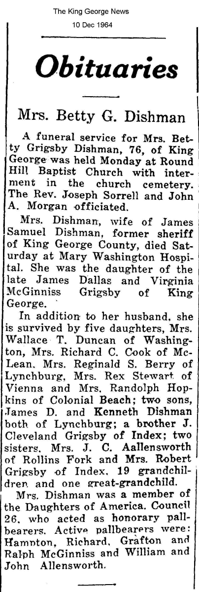 - [S751] "Obituaries," Betty G. Dishman, The King George News, King George, King George County, Virginia, 10 Dec 1964.