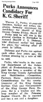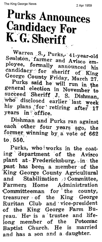 - [S752] "Purks Announces Candidacy for K.G. Sheriff,"Sheriff canidacy, The King George News, King George, King George County, Virginia, 2 Apr 1959.