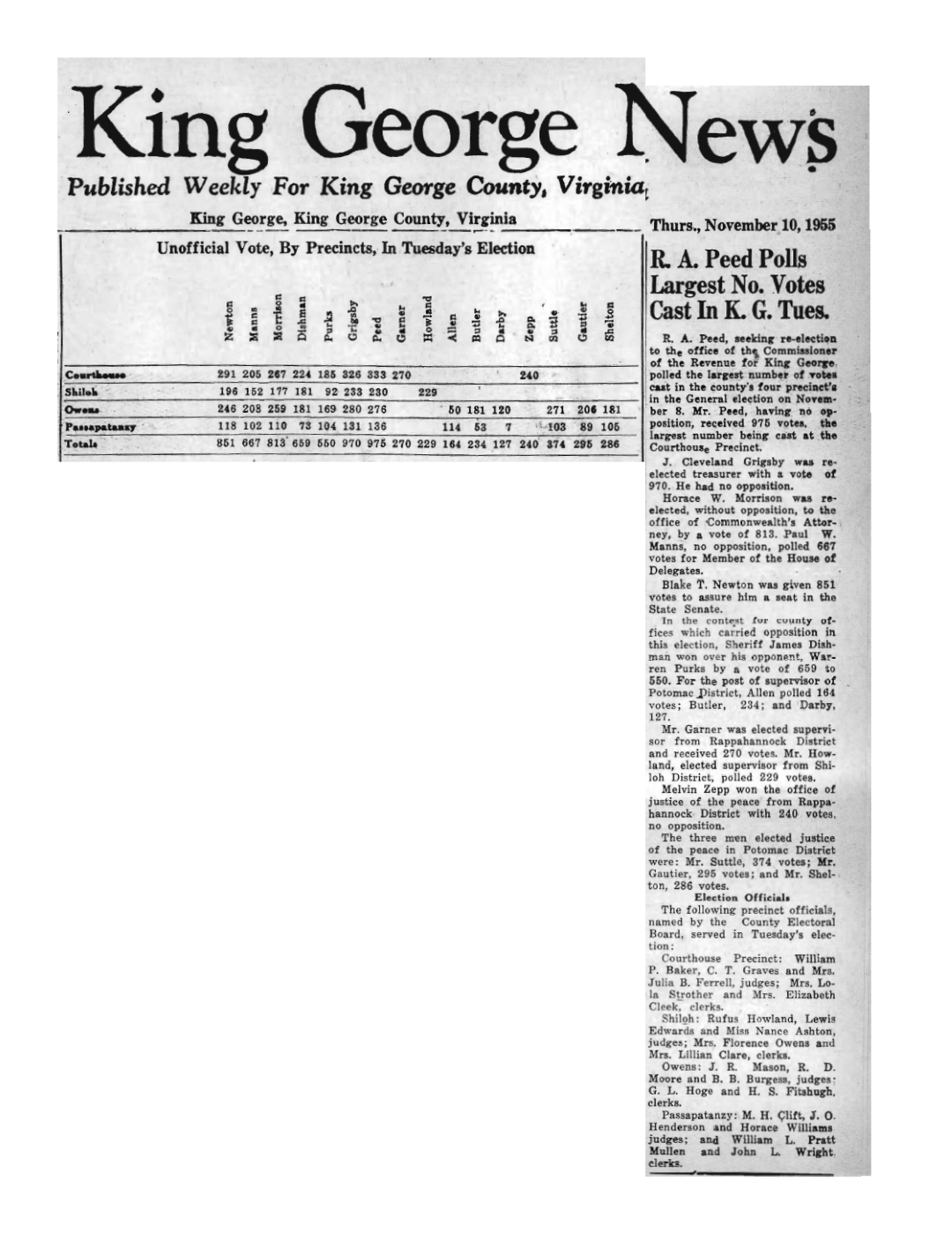 - [S753] "R.A. Peed Polls Largest No. Votes Cast In K.G. Tues.,"Sheriff election, The King George News, King George, King George County, Virginia, 10 Nov 1955.