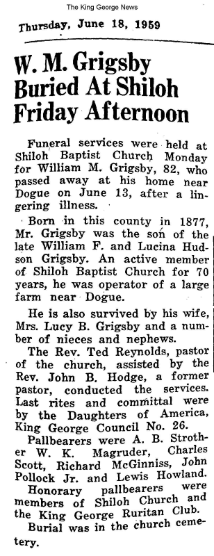 - [S754] "W.M. Grigsby Buried at Shiloh Friday Afternoon," William M. Grigsby, The King George News, King George, King George County, Virginia, 18 Jun 1959.
