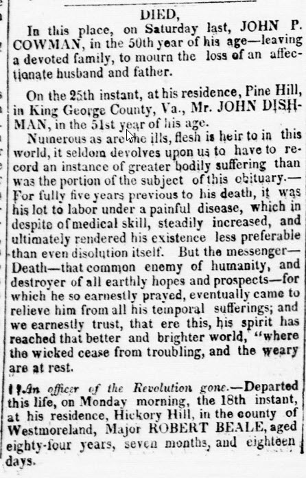 - [S762] "Died," John Dishman, Alexandria Gazette, Alexandria, Alexandria County, Virginia, 27 Sep 1843, p.3; citing Chronicling America.