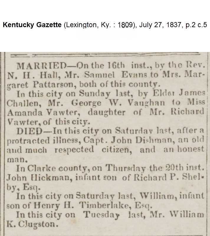 - [S770] "DIED,"John Dishman, The Kentucky Gazette, Lexington, Fayette County, Kentucky, 27 Jul 1837 (https://rescarta.lexpublib.org/jsp/RcWebImageViewer.jsp?doc_id=4086b9c4-2fd5-4231-a294-0b3dbb3b0cfa/KYLX0000/20191112/00001951&pg_seq=2&search_doc=&query1_modifier=AND&query1=john%20dishman&query1_field=ALL : accessed 17 May 2025); citing the Lexington Public Library Digital Archives.