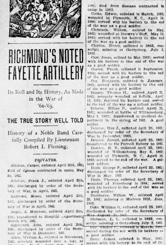 - [S772] "Our Confederate Column - Richmond's Noted Fayette Artillery,"L.L. Dishman missing, Richmond Times-Dispatch, Richmond, Virginia, 6 Aug 1905, p.28 (https://www.newspapers.com/image/827294588 : accessed 29 May 2025); citing Newspapers.com.