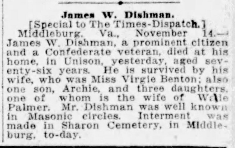 S0786--Obit--1913-11-15--Richmond_Times_Dispatch--James W. Dishman
