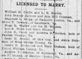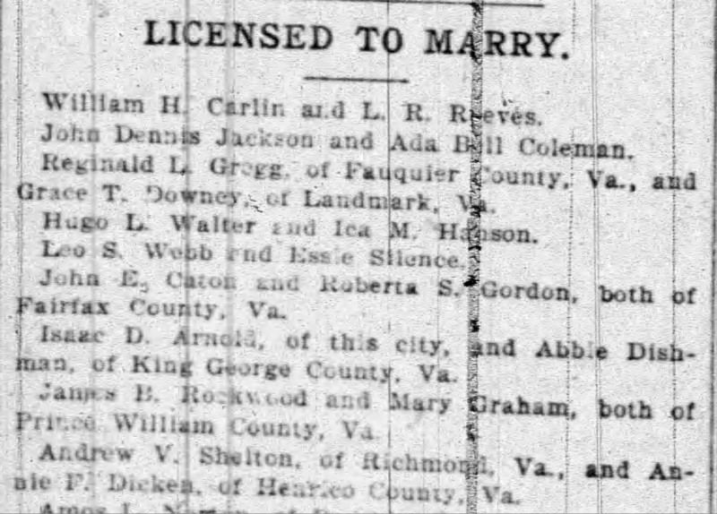 - [S822] "Licensed To Marry,"Isaac Arnold and Abbie Dishman marriage, The Washington Post, Washington, District of Columbia, 23 Dec 1902, p.3 (https://www.newspapers.com/image/1037722191 : accessed 29 May 2025); citing Newspapers.com.