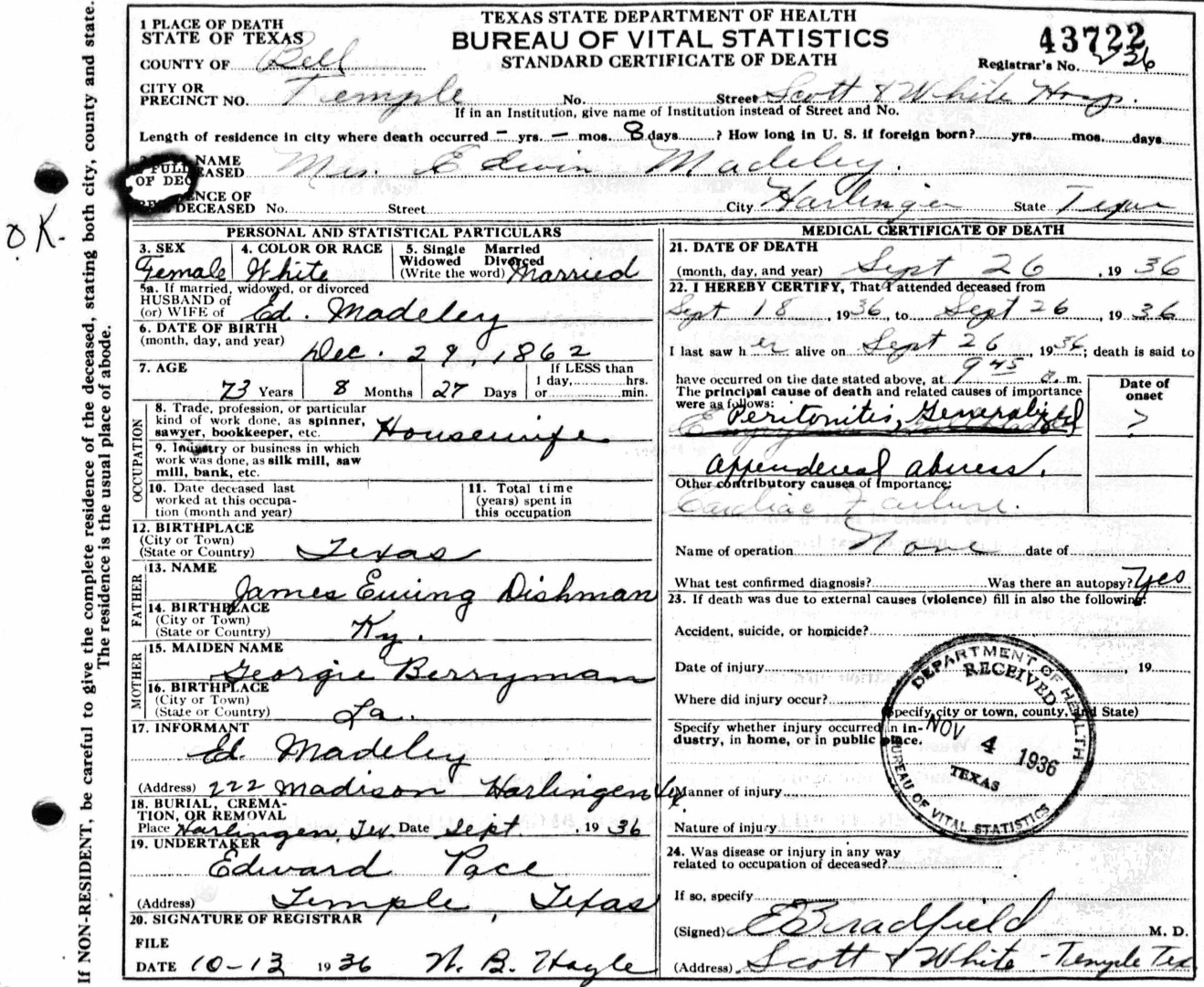 S0974--Death Cert--1936--Texas--Mrs. Edwin Madeley