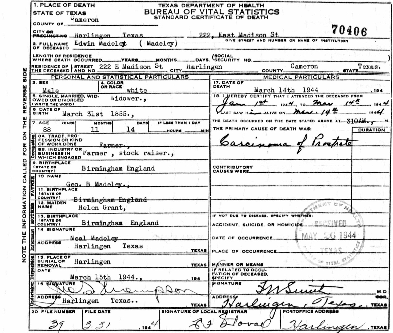 S0975--Death Cert--1944--Texas--Edwin Madeley