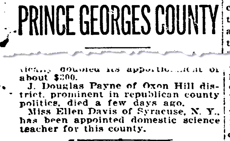 - [S978] "Prince Georges County,"J. Douglas Payne death, Evening Star, Washington, District of Columbia, 9 Mar 1919, p.19 (https://www.genealogybank.com/doc/newspapers/image/v2%3A13D5DA85AE05A305%40GB3NEWS-16272E0C52D1CD14%402422027-16272E6F151CAEA0%4019-16272E6F151CAEA0%40?lname=payne&dateType=date&formDate=3/9/1919&formDateFlex=exact&rgtoDate=8/22/1857&rgfromDate=3/9/1919 : accessed 26 May 2025); citing GeanealogyBank.