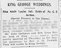 - [S758] "King George Weddings,"John Dishman and Lena Suttle marriage, Richmond Times-Dispatch, Richmond, Virginia, 29 Dec 1901, p.16 (https://www.newspapers.com/image/81019899 : accessed 29 May 2025); citing Newspapers.com.