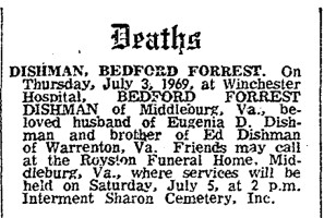 - [S818] "Deaths,"Bedford Forrest Dishman, The Evening Star, Washington, District of Columbia, 4 Jul 1969, p.23 c.5 (https://www.genealogybank.com/doc/newspapers/image/v2%3A13D5DA85AE05A305%40GB3NEWS-14E3DC1DAF4EF9DD%402440407-14E19F0E45D4950E%4022-14E19F0E45D4950E%40?lname=dishman&dateType=range&formDateFlex=exact&rgtoDate=jul%201969&rgfromDate=jul%201969 : accessed 25 May 2025); citing GenealogyBank.