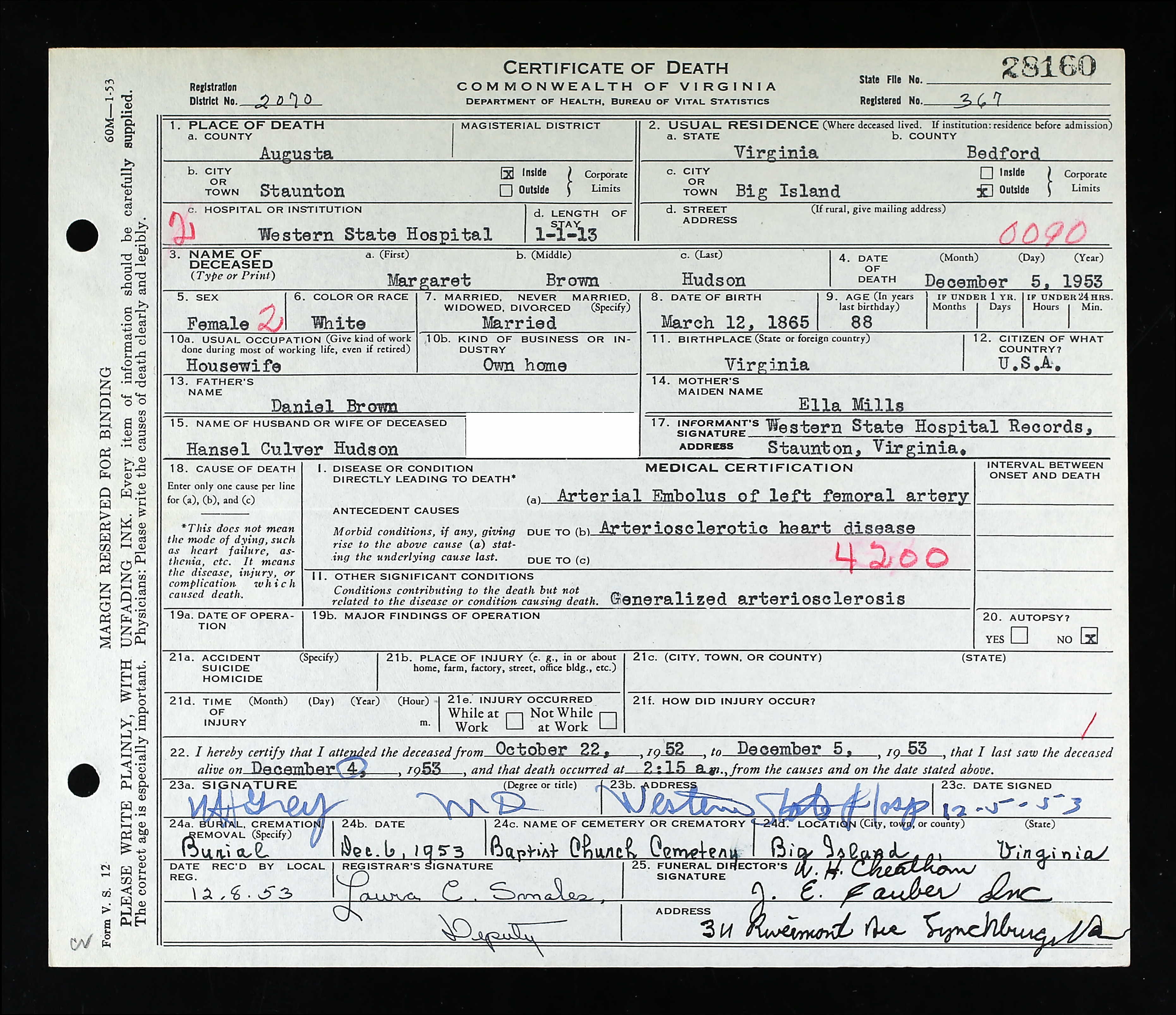 S0590--Death Cert--1953-12-05--Augusta Co. VA--Margaret Brown Hudson