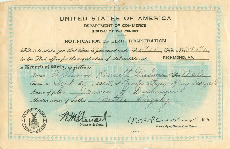 S1399 - Birth Record - 1928-09-02 - William Kenneth Dishman - Nindes Store VA