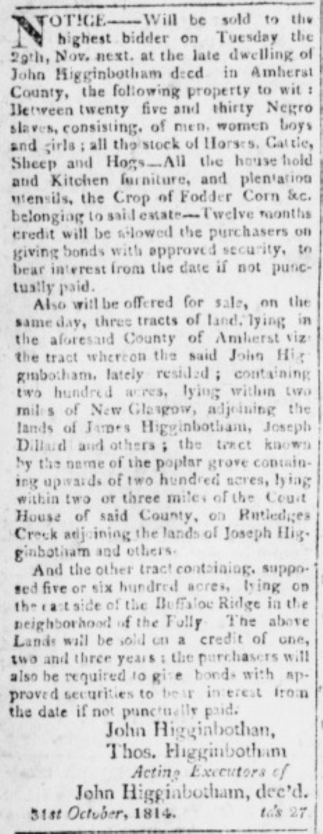 S0765--News--1814-11-10--Lynchburg Press--Higginbotham Estate Sale