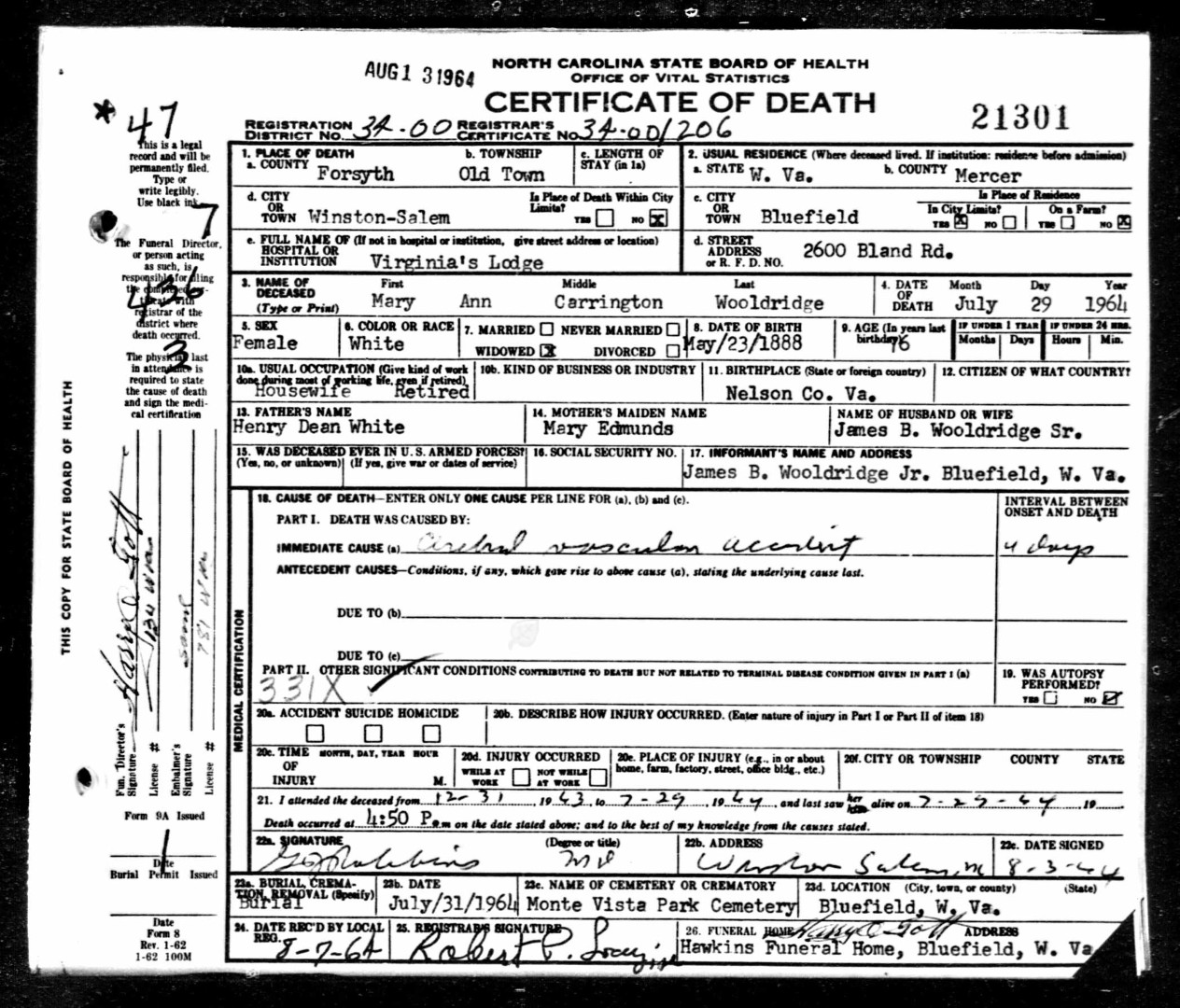 S1843--Death Cert--1964--North Carolina--Mary Ann Wooldridge