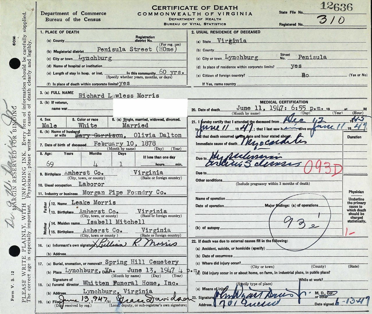 S0928--Death Cert--1947--Virginia--Richard Lwaless Morris