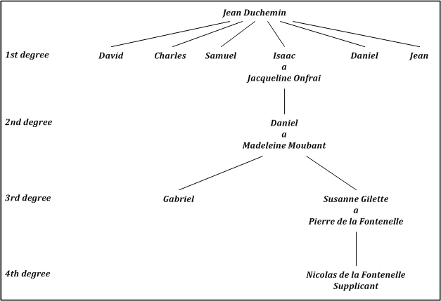 Isaac Duchemin owned, with his brother Samuel, several houses and about 22 acres of land at Landisacq in the village of La Haute Hagrie that were confiscated in 1688 by the king due to the emigration of Isaac and Samuel from France. This property was returned to Isaac’s great-grandson Nicolas de la Fontenelle in 1791 following a successful claim for restitution. The request for restitution[2] includes a genealogical chart tracing the line of descendants from Jean Duchemin to Nicolas de la Fontenelle (reproduced below). This document included the following statement (translated):