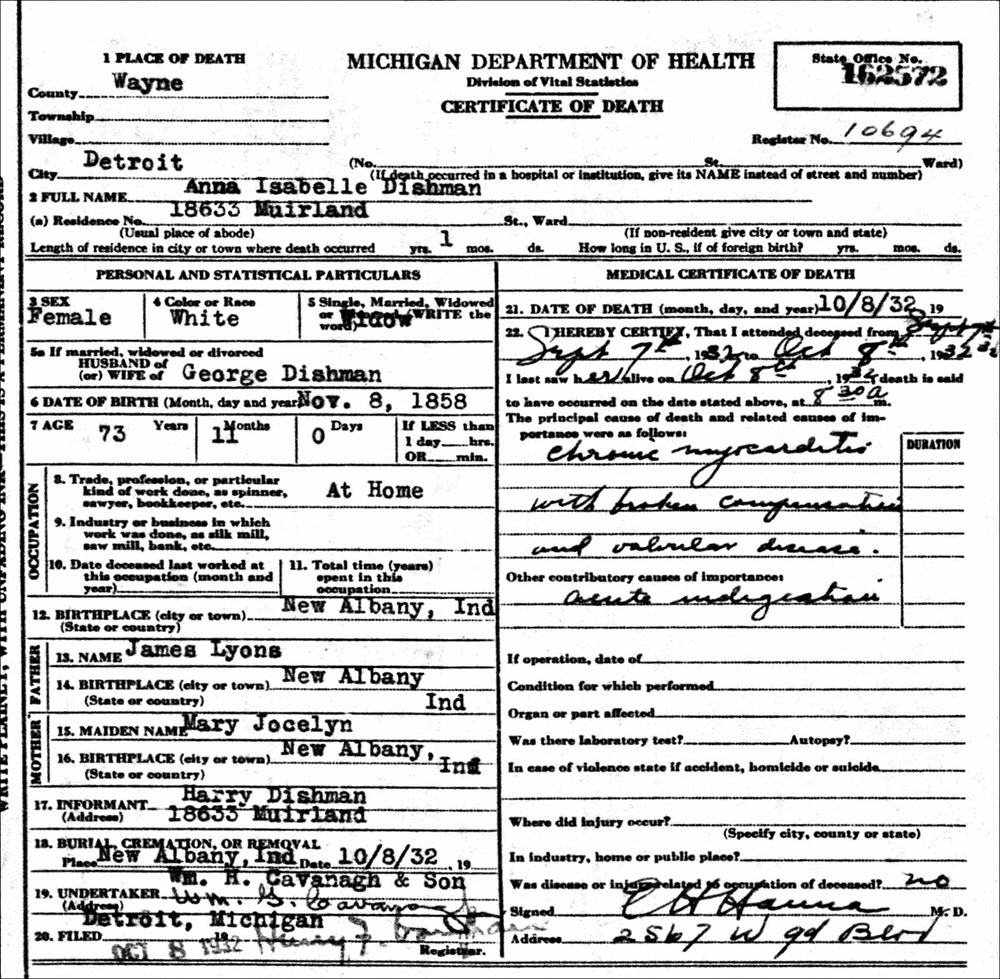Death Certificate - Anna Isabelle Lyons