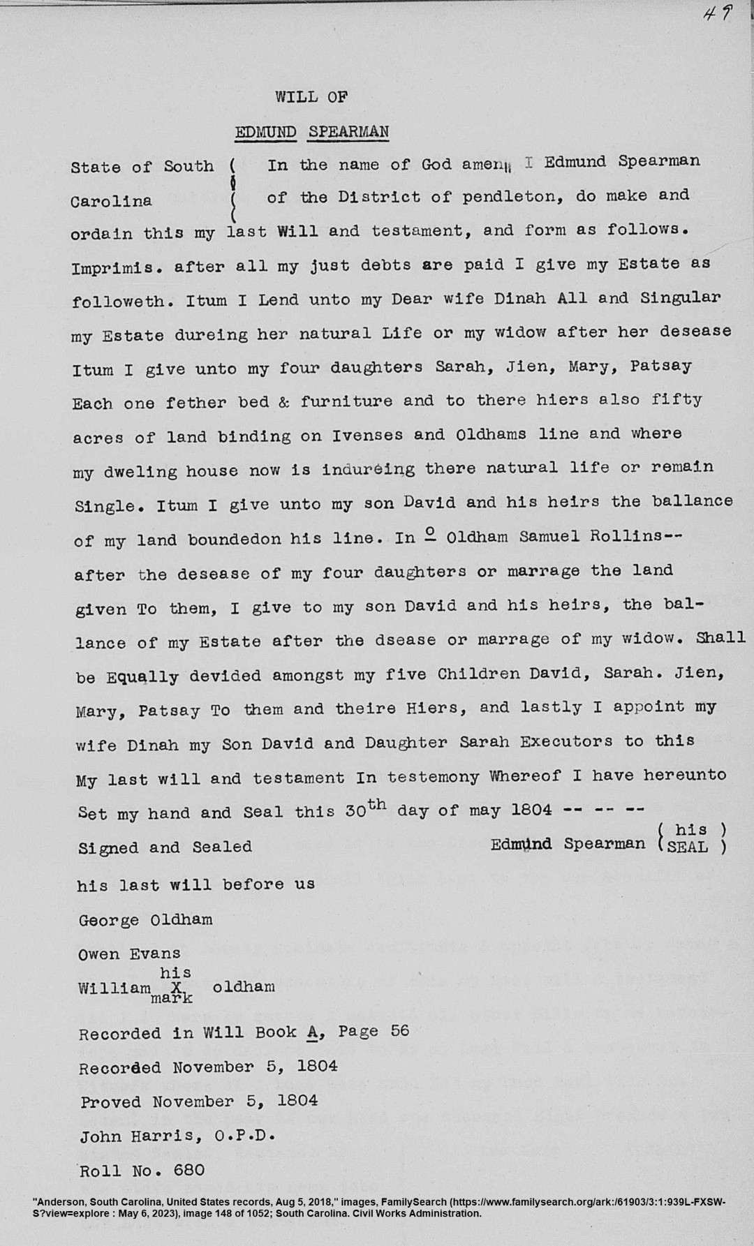 - [S1927] Anderson County, South Carolina, Record of Wills, Vol. 1, Book C & A, 1791-1834: p.49, Edmund Spearman will (transcript), 30 May 1804; imaged, FamilySearch (https://www.familysearch.org/ark:/61903/3:1:939L-FXSW-S): accessed 20 Jan 2026), image group number 004752970, image 148 of 1052; citing Will Book A, p. 56. Proved 5 Nov 1804.