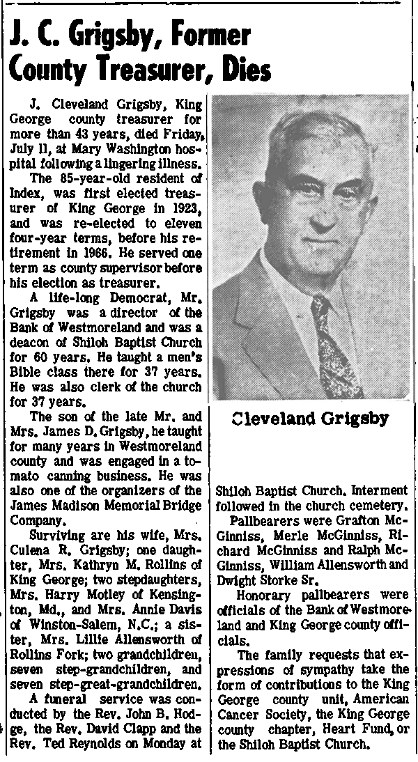- [S291] "J.C. Grigsby, Former County Treasurer, Dies," J. Cleveland Grigsby, The King George News, King George, King George County, Virginia, 15 Jul 1970.