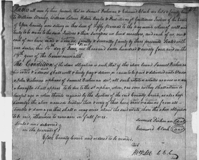 - [S298] Essex County, Virginia, Guardianship Account Records 1761-1796: p. 212, "Samuel Dishman guardianship bond", 16 Jun 1774; imaged, FamilySearch (https://www.familysearch.org/ark:/61903/3:1:3Q9M-CSK4-Z4ZR?view=explore&groupId=TH-909-71320-6317-11&lang=en): accessed 4 Jan 2026), image group number 008141172, image 118 of 128; citing Essex County courthouse records.