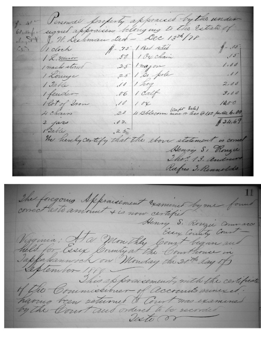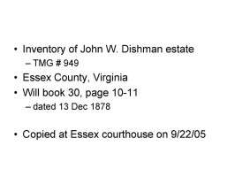 - [S302] Essex County, Virginia, Will Book 30, 1880-1896: pp. 10-11, "J.W. Dishman estate appraisal", 13 Dec 1878; imaged; citing Essex County courthouse records.