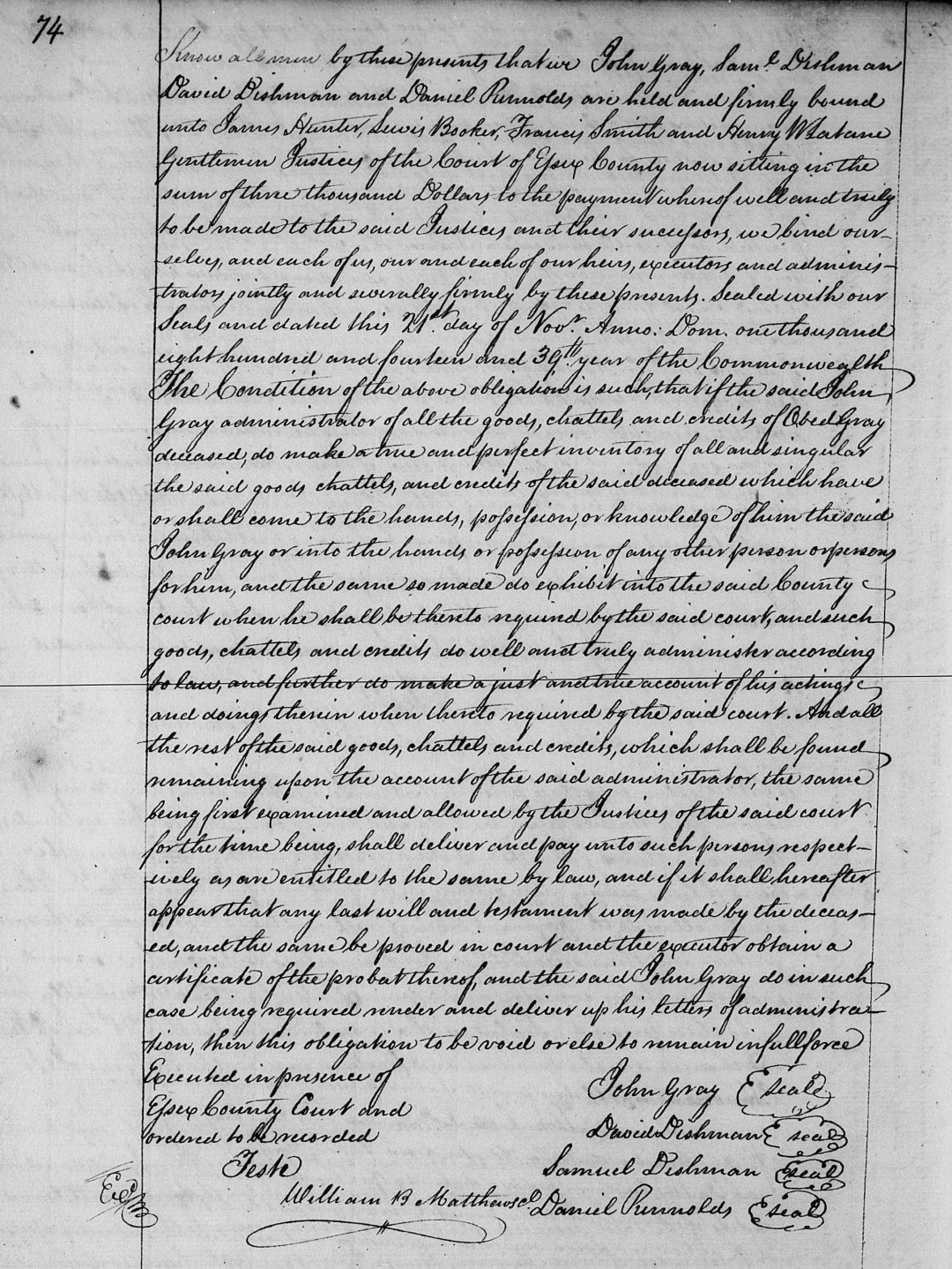 S0303--Admin Bond--1814--Essex Co. VA--Obediah Gray--p.74