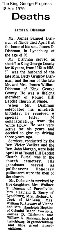 - [S309] "Deaths," James S. Dishman, The King George Progress, King George, King George County, Virginia, 18 Apr 1979.
