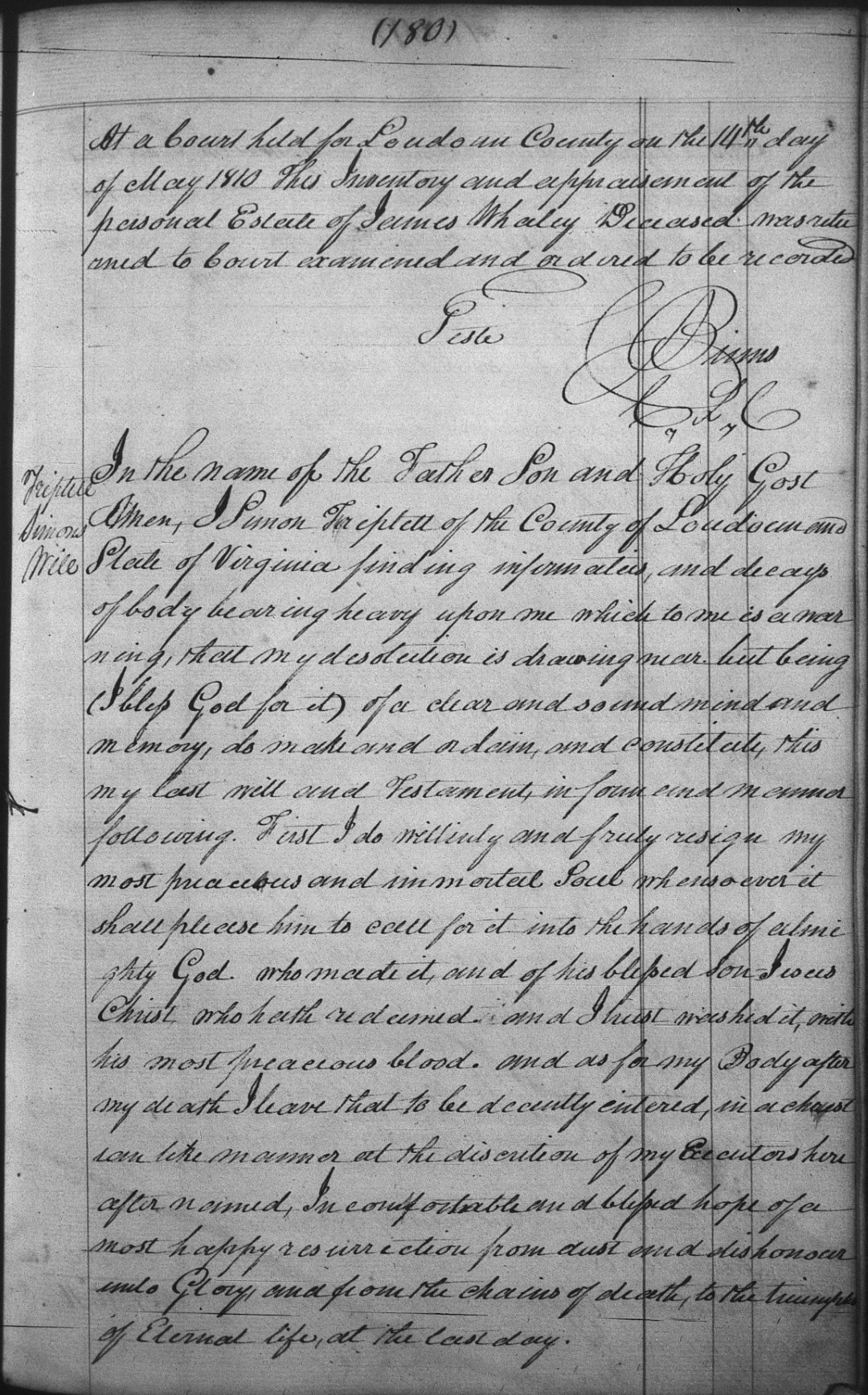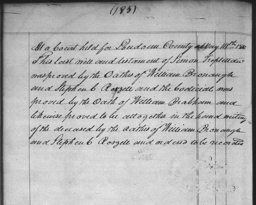 - [S344] Loudoun County, Virginia, Will Book, I with Inventories and Accounts, 1809-1811: pp. 180-185, Simon Triplett will, 22 Feb 1806; imaged, FamilySearch (ttps://www.familysearch.org/ark:/61903/3:1:3QS7-99P6-RGT): accessed 27 Jan 2026), image group number 7645413, images 107-110 of 459.