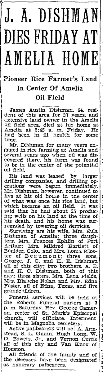 - [S349] "J. A. Dishman Dies Friday at Amelia Home,"James Austin Dishman, Beaumont Journal, Beaumont, Jefferson County, Texas, 31 Dec 1937, p.1 c.5 (https://www.genealogybank.com/doc/newspapers/image/v2%3A1379ABB5EAD0D0AA%40GB3NEWS-1699D7890AA740E0%402428899-16988320A186C118%400-16988320A186C118%40?lname=dishman&fname=james&dateType=date&formDate=dec%201937&formDateFlex=exact&rgtoDate=1839&rgfromDate=3/14/1839 : accessed 20 May 2025); citing GenealogyBank.