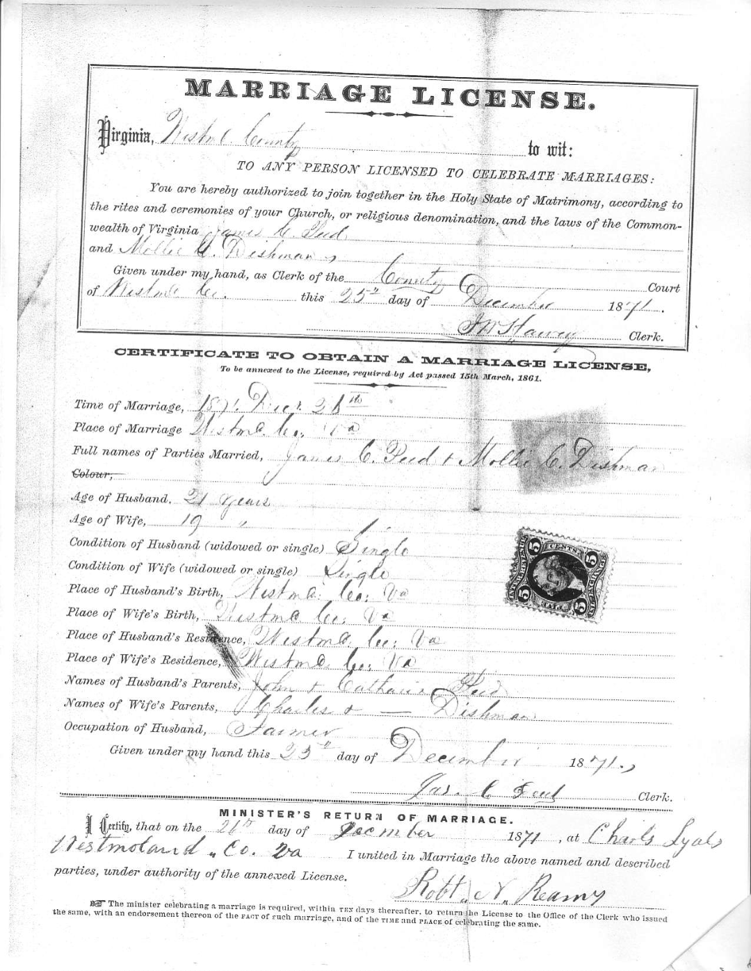 - [S384] Westmoreland County, Virginia, Marriage License and Return, James C. Peed and Mollie C. Dishman, 25 Dec 1871.