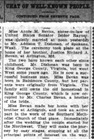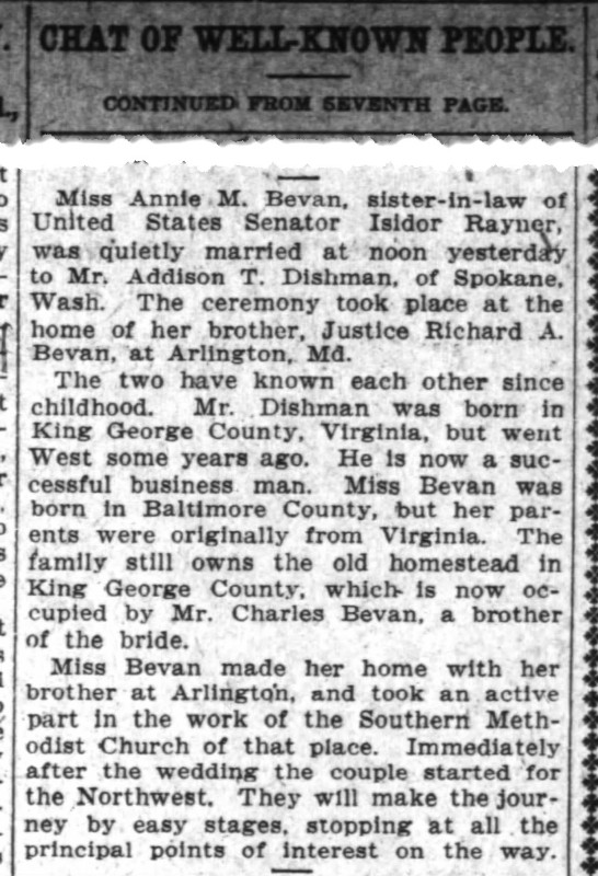 - [S400] "Chat of Well Known People,"Annie Bevan and Addison Dishman marriage, The Washington Post, Washington, District of Columbia, 2 Apr 1908, p.11 (https://www.newspapers.com/image/28798944 : accessed 29 May 2025); citing Newspapers.com.