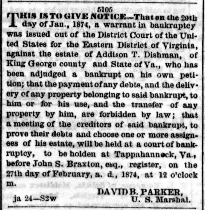 - [S402] "Bankrupt Notices,"Addison T. Dishman bankruptcy notice, The Daily State Journal, Alexandria, Alexandria County, Virginia, 24 Jan 1874, p.3 c.4 (https://www.virginiachronicle.com/?a=d&d=DSJ18740124.1.3 : accessed 28 May 2025); citing Virginia Chronicle - Digital Newspaper Archive.