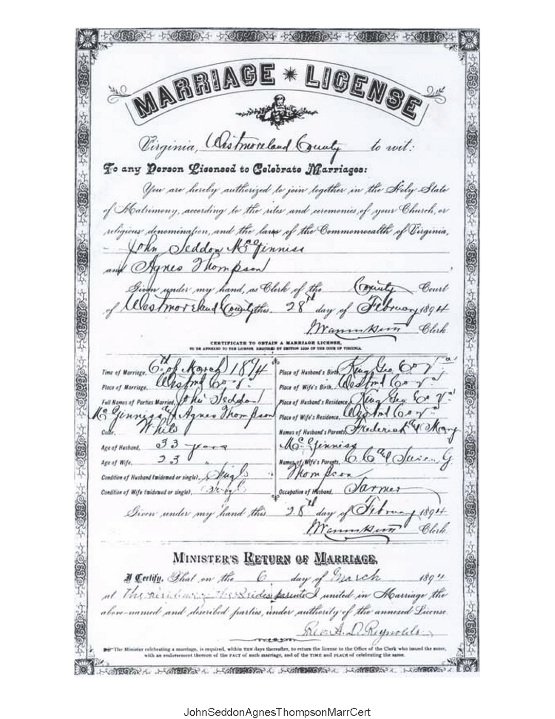 - [S447] Westmoreland County, Virginia, Marriage License and Return, John Seddon McGinniss and Agnes Thompson, 28 Feb 1894.