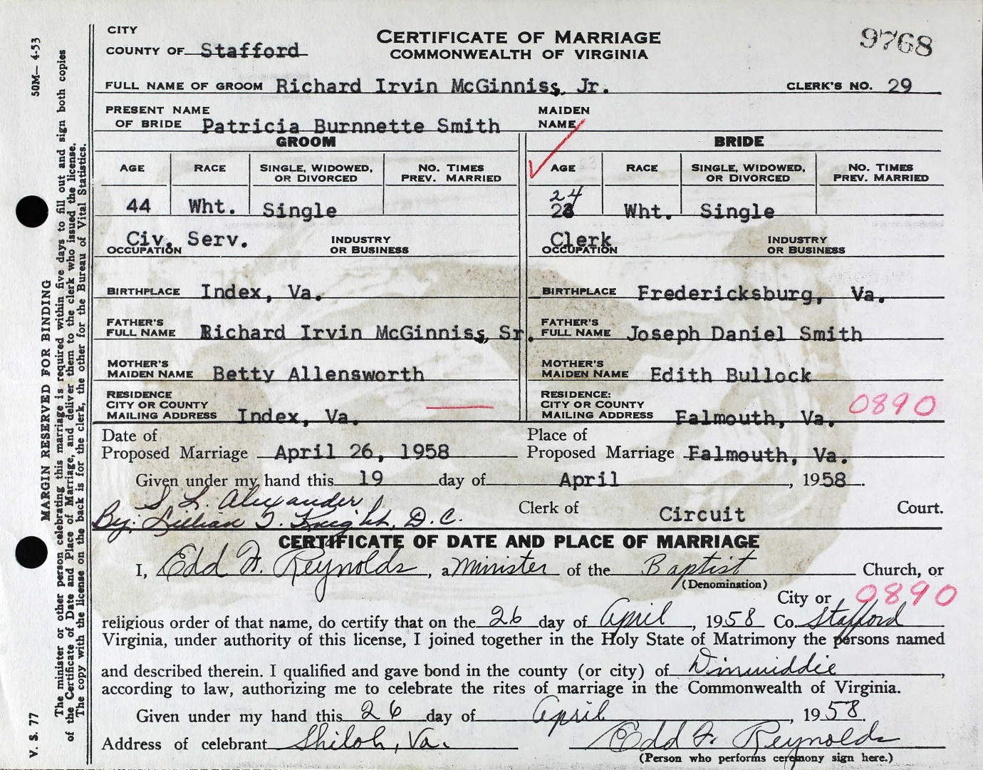 - [S460] Stafford County, Virginia, Marriage Certificate, No. 9768, Richard Irvin McGinniss Jr and Patricia Burnette Smith, 26 Apr 1958.
