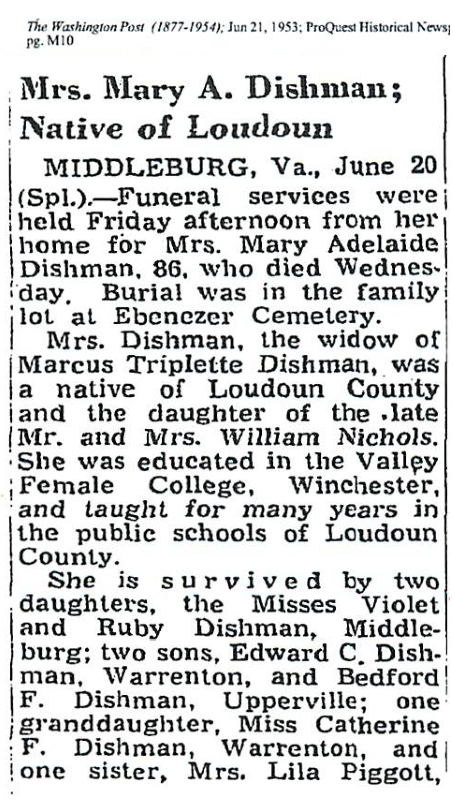 - [S497] "Mrs. Mary A. Dishman, Native of Loudoun,"Mary Adelaide Dishman, The Washington Post, Washington, District of Columbia, 21 Jun 1953, p.M10 ( : accessed); citing ProQuest Historical News.