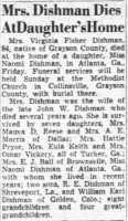 - [S287] "Mrs. Dishman Dies at Daughter's Home,"Virginia Fisher Dishman, Dallas Morning News, Dallas, Dallas County, Texas, 11 Mar 1940 (https://www.genealogybank.com/doc/newspapers/image/v2%3A0F99DDB671832188%40GB3NEWS-10338293D52EE2E5%402429700-1033829409C1F47A%406-1033829576EA16BB%40Grayson%2BPioneer%2BDies%2Bat%2BHis%2BHome?lname=dishman&dateType=range&formDateFlex=exact&rgtoDate=1940&rgfromDate=1940 : accessed 7 Jan 2017); citing GenealogyBank.com.